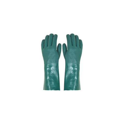 Luva de segurança confeccionada em PVC com forro de algodão, com palma áspera. Comprimento de punhos 25 cm, 35 cm.